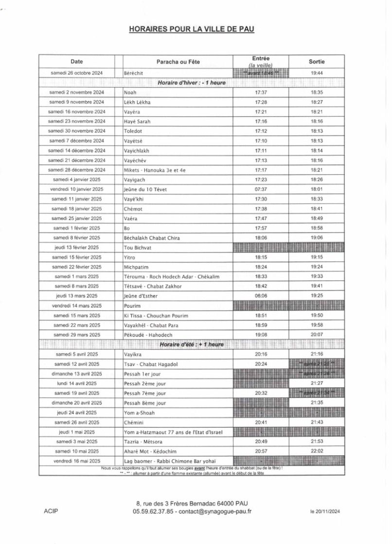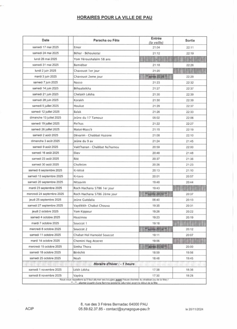 minha vendredi soir à 19h 30 suivi de l'office d'Arvit ( voir dessous les horaires de début de Chabat)